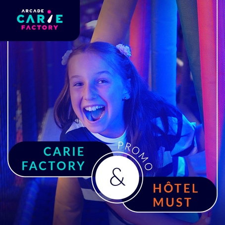 Faites des heureux avec le Forfait Carie Factory et Hôtel MUSTCe lien s'ouvrira dans une nouvelle fenêtre ! Eh oui, un séjour au MUSTCe lien s'ouvrira dans une nouvelle fenêtre avec son décor moderne et accueillant, déjeuner continental et accès à la piscine intérieure, bain à remous, jeux et glissade d’eau inclus, et un accès familial pour LE centre d’arcade à Québec, à même l’hôtel. Le centre d’amusement Carie FactoryCe lien s'ouvrira dans une nouvelle fenêtre avec ses jeux illimités, un manège 4D, un labyrinthe, le Ball-O-Cité, et beaucoup plus vous attend pour un divertissement assuré pour grands et moins grands !