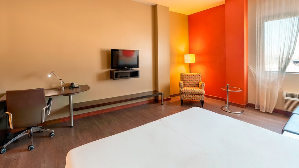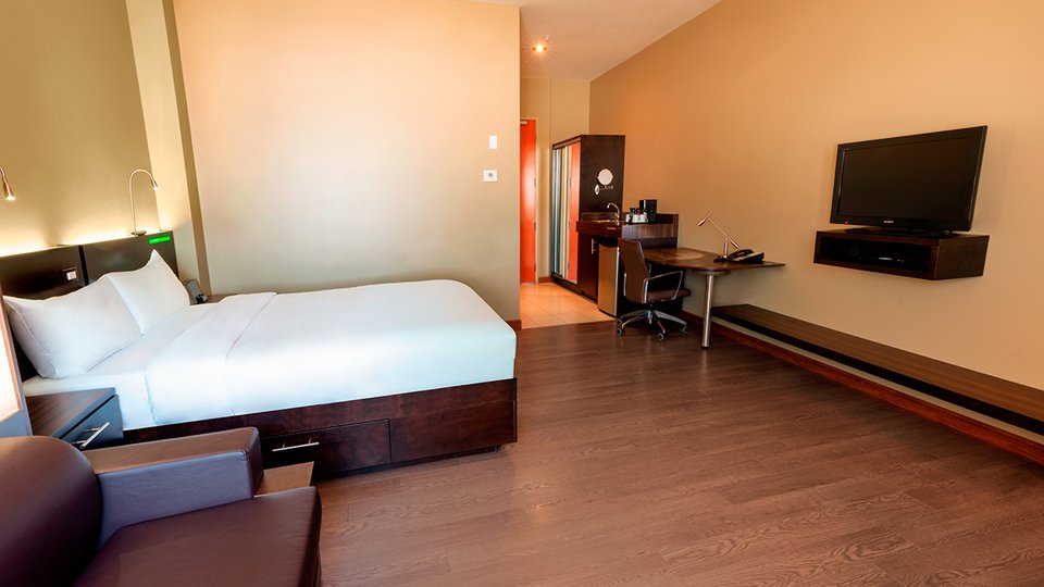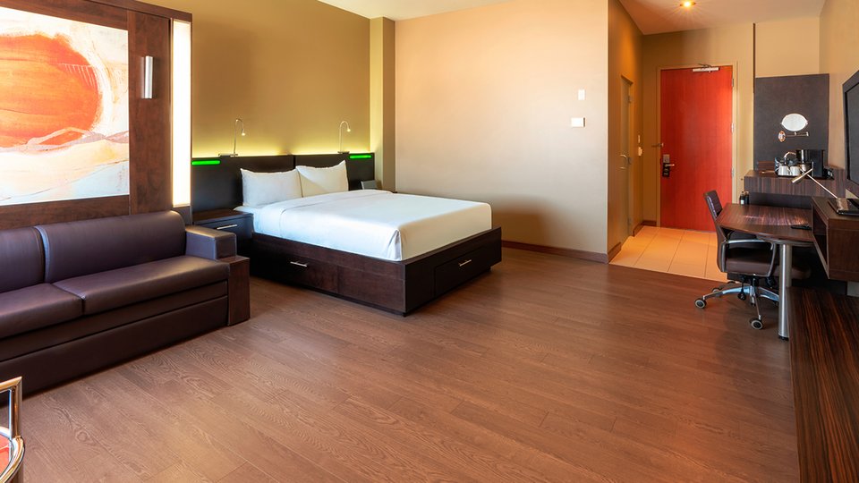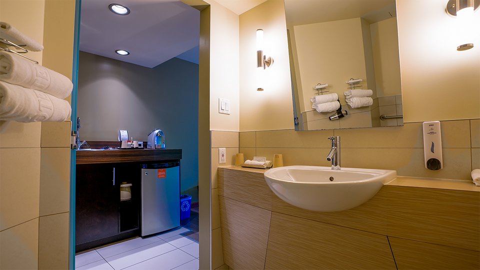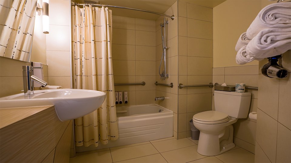 Semi-wheelchair accessible room with two queen-size beds, including a Murphy bed that can easily be converted into a sofa. The large bathroom has a bath shower equipped with support bars, tilted mirrors and a transfer bench.