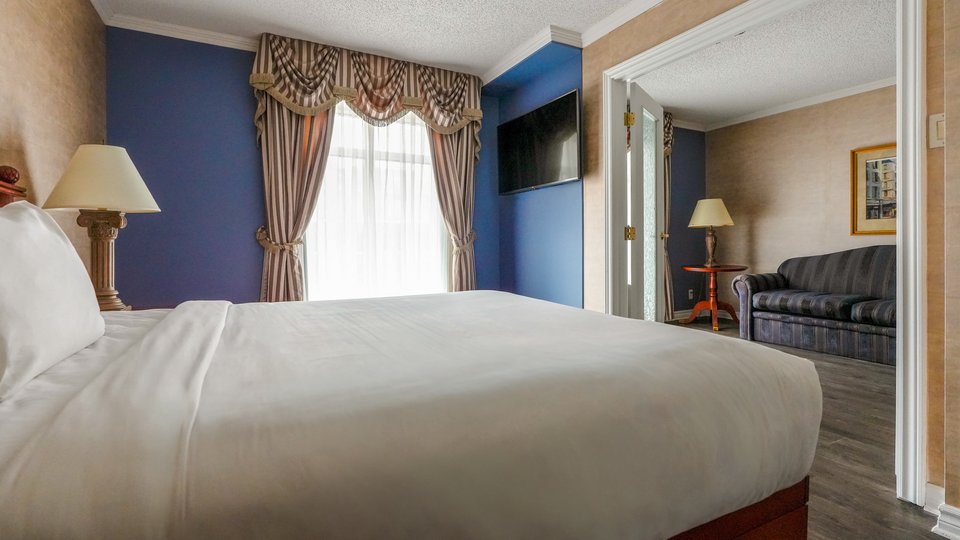 2-room suite in which the main room is equipped with a sofa bed, a television and a work table. The master bedroom has a queen bed and a television.