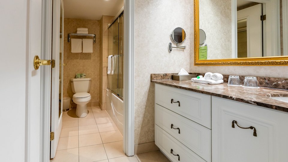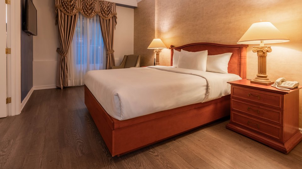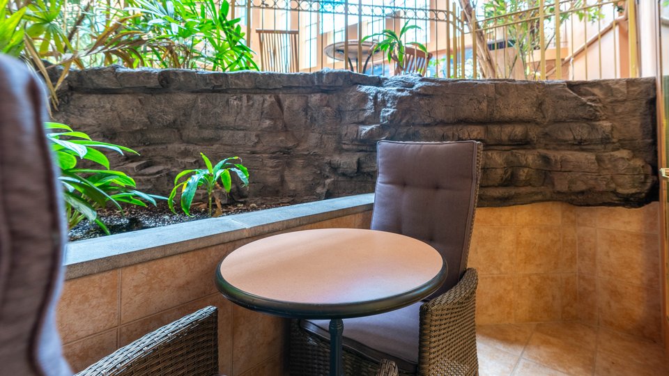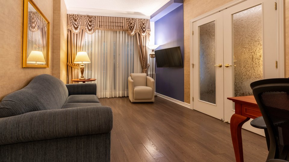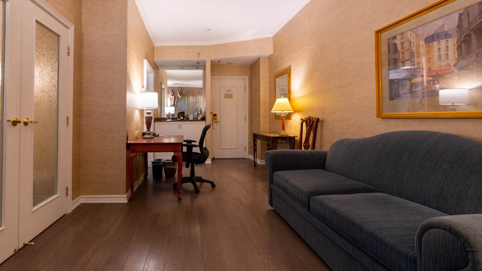 2-room suite in which the main room is equipped with a sofa bed, a television and a work table. The master bedroom has a queen-size bed and a television. This room is located slightly under the level of the indoor garden.
