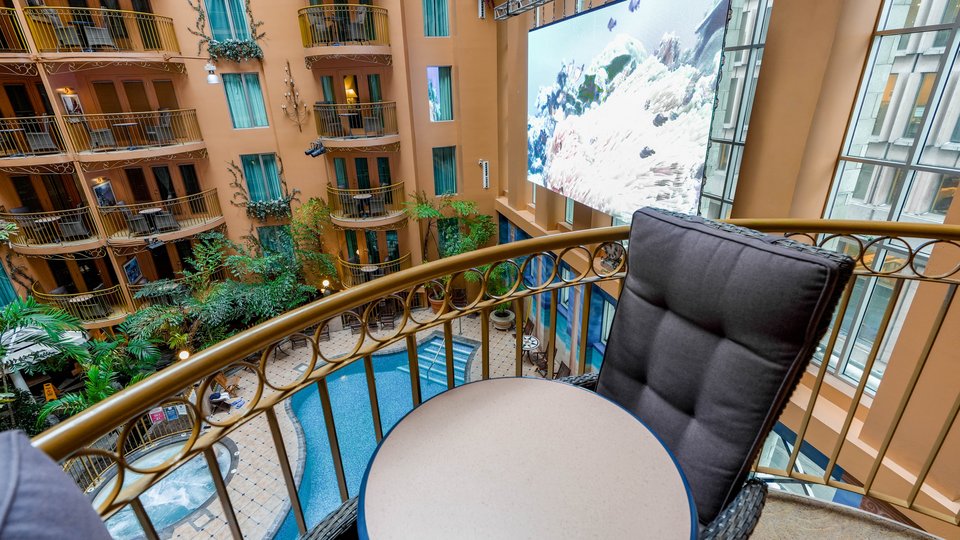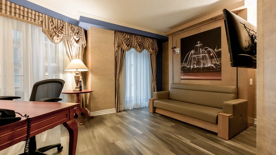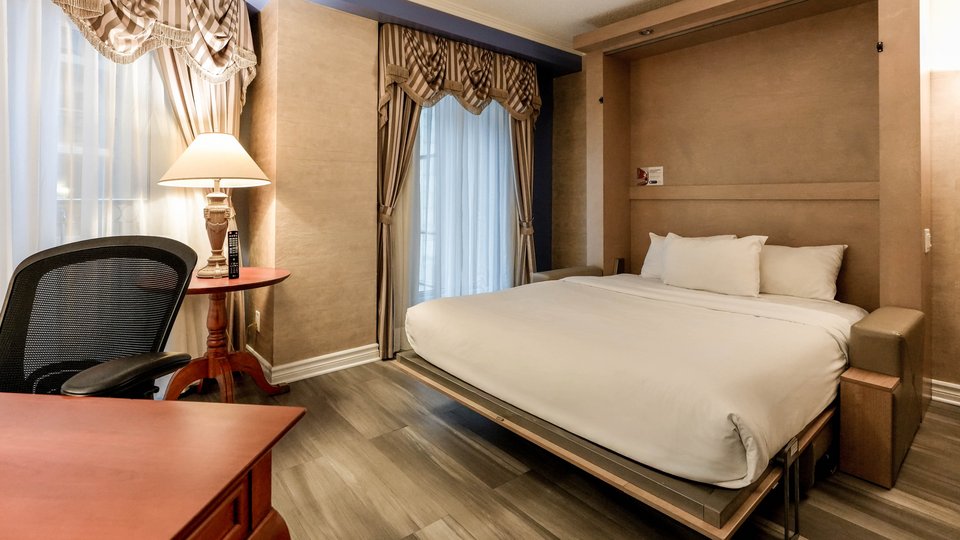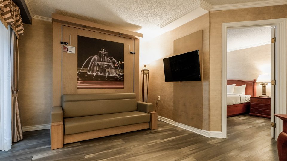 2-room suite in which the main room is equipped with a queen-size Murphy bed that can easily be converted into a 3-seater sofa. The master bedroom has 1 queen-size bed. The rooms both have a television. This suite has a balcony overlooking the indoor garden.