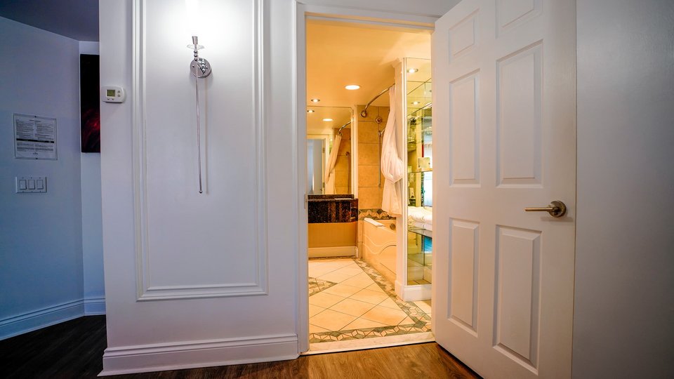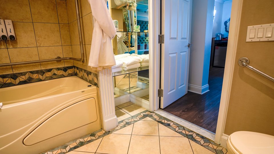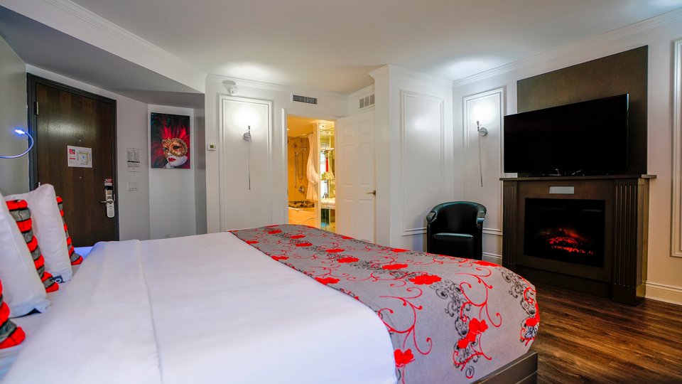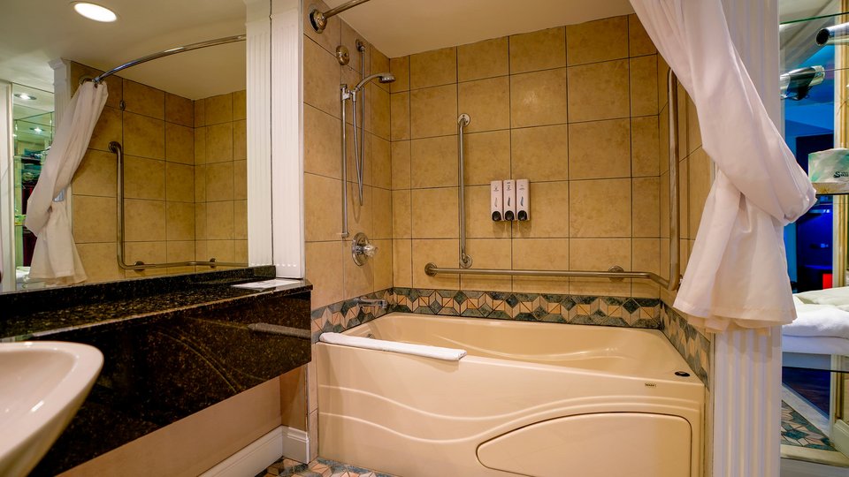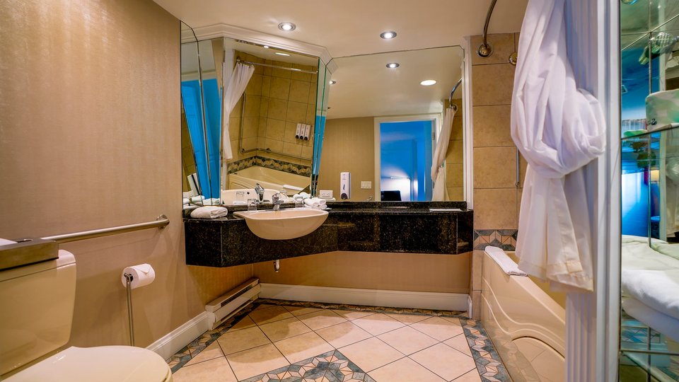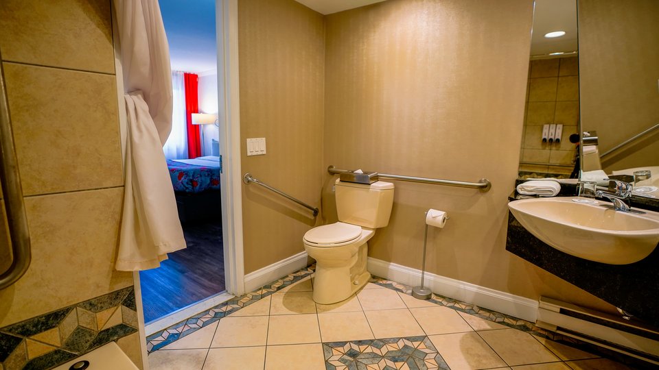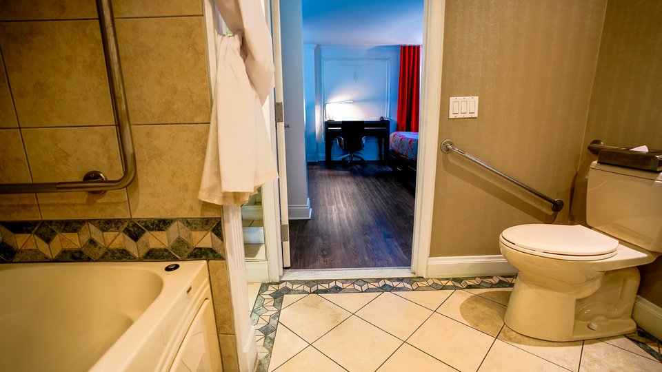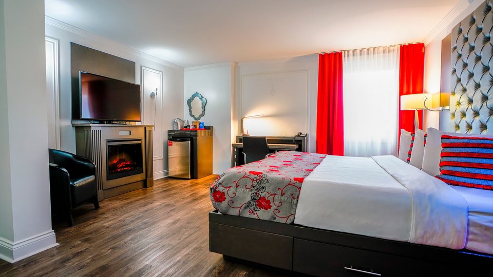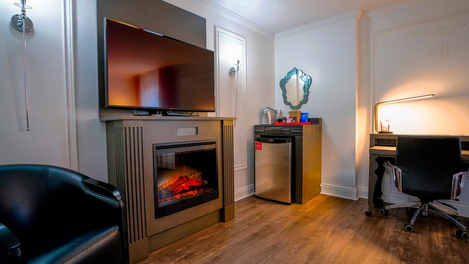 Semi-wheelchair accessible room with one king-size bed lined with a memory foam mattress. The thick curtains guarantee the most total darkness. The large bathroom has a bath shower equipped with support bars, tilted mirrors and a transfer bench. The decorative fireplace provides a cozy yet elegant setting. The privilege advantage and fireplace insure a relaxing, cozy and elegant setting.