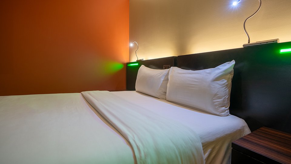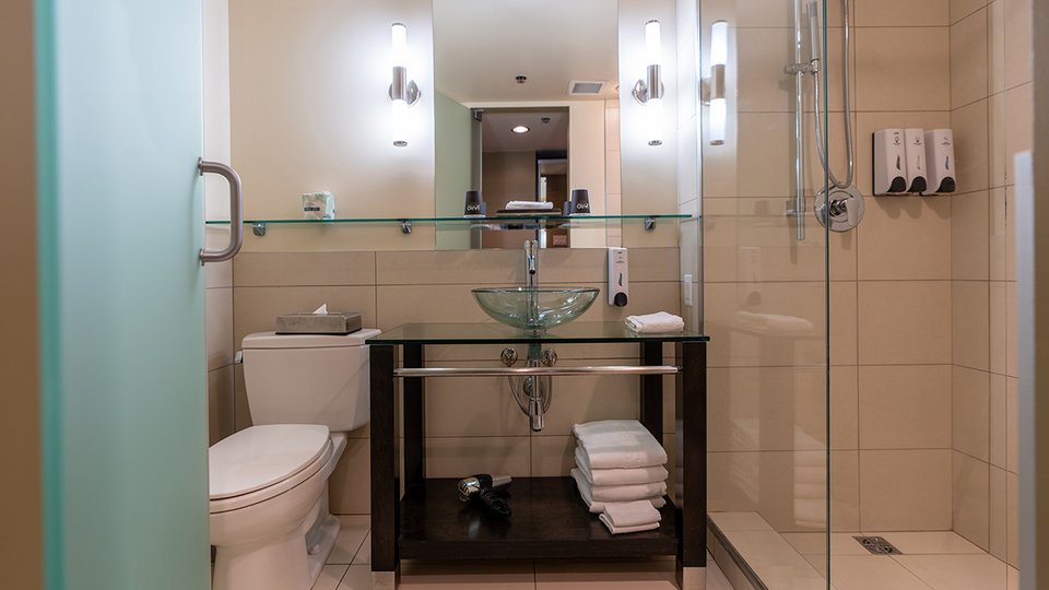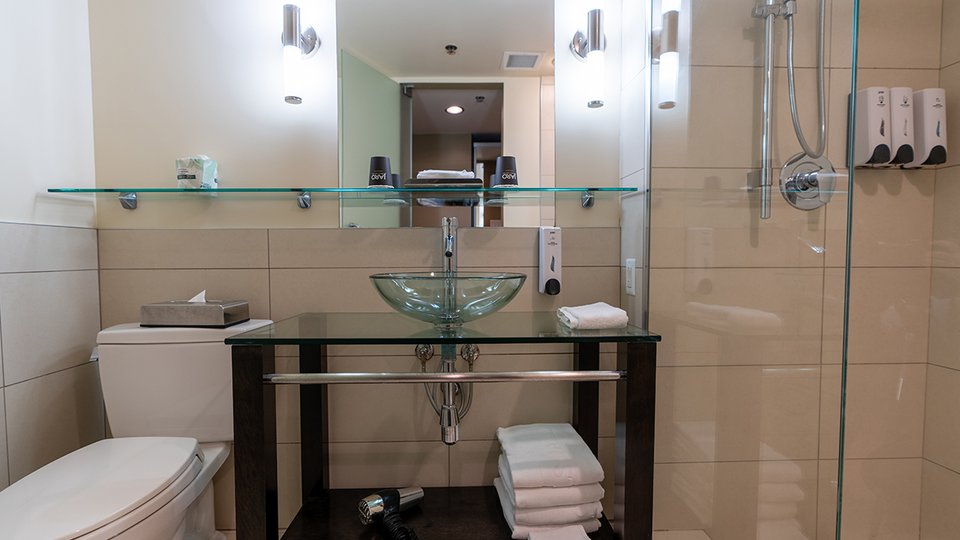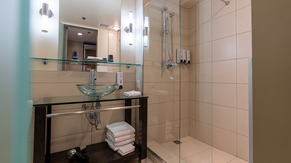 Chambre avec deux grands lits et une salle de bain équipée d’une douche. Cette chambre ne dispose pas de fenêtre, ce qui garantit un sommeil profond.
