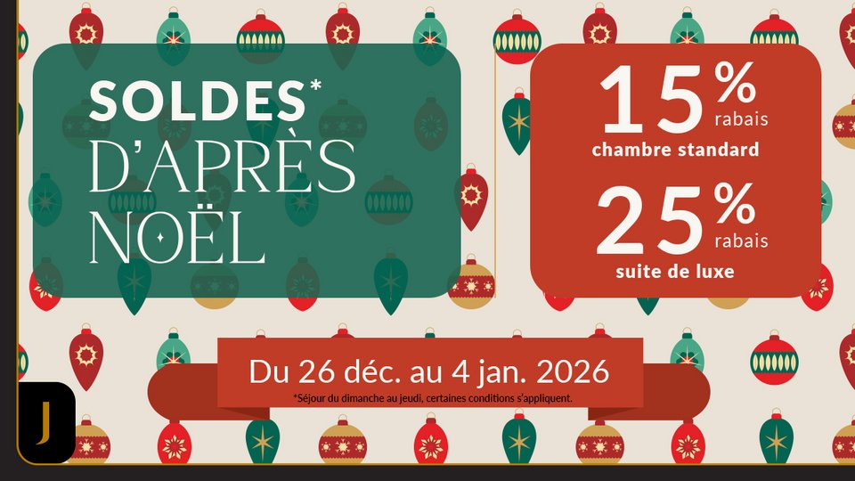 Les fêtes continuent chez Hôtels JARO ! Offrez-vous une escapade à prix doux grâce à nos rabais exceptionnels :