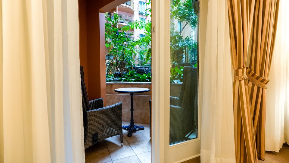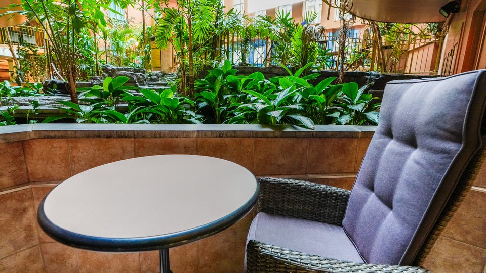 Chambre à un grand lit avec vue partielle sur le jardin intérieur. Cette chambre est située légèrement en dessous du niveau du jardin intérieur.
