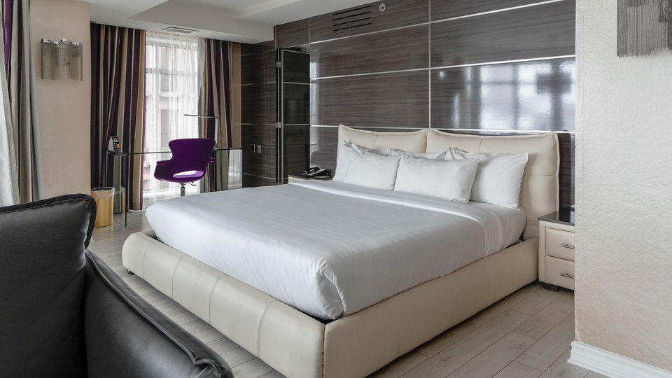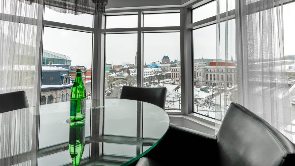 Chambre à un grand lit avec vue sur la Basse-Ville de Québec.