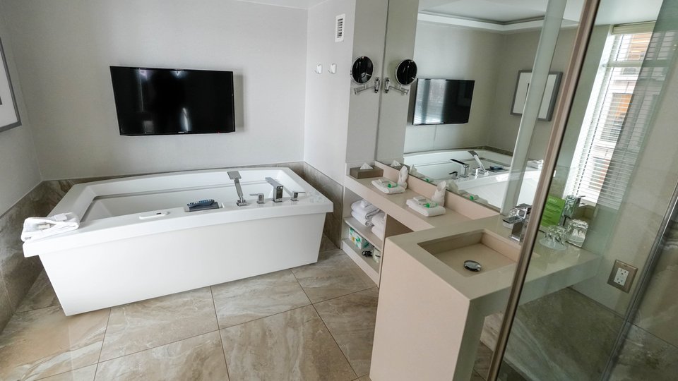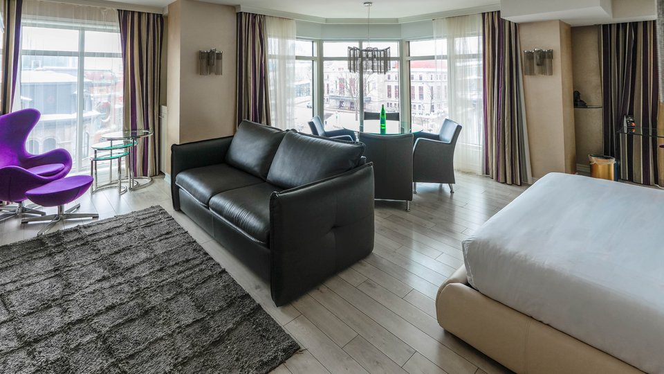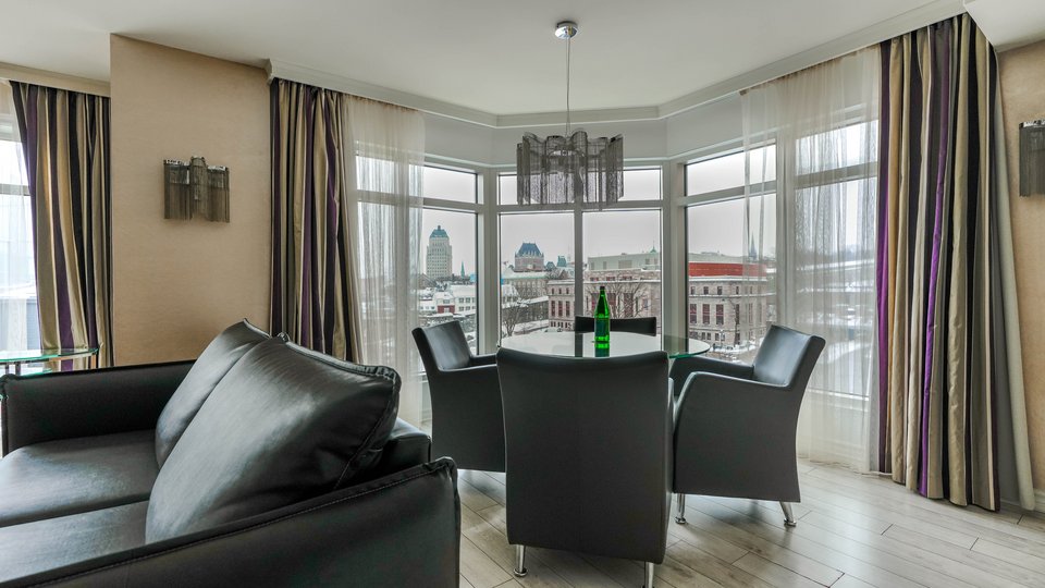 Studio composé d’un très grand lit et d’un divan-lit avec vue sur la place D’Youville. La grande salle de bain est dotée d’un bain et d’une douche à multijets. La chambre et la salle de bain sont équipées chacune d’une télévision. Le foyer d’ambiance assure une atmosphère feutrée et de tout repos.