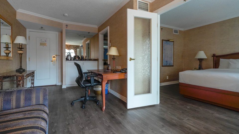 Suite constituée de 2 pièces dont la principale est dotée d’un divan-lit, d’une télévision et d’une table de travail. La chambre des maîtres est dotée d’un grand lit et d’une télévision.