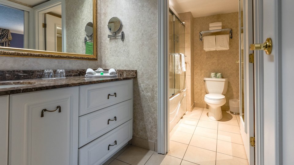 Chambre à un grand lit avec vue sur la Basse-Ville de Québec.