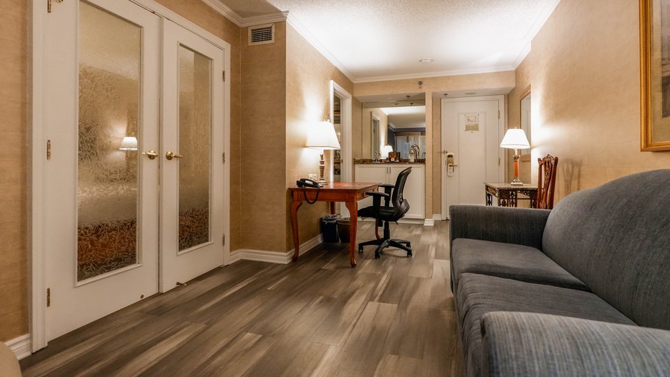 Chambre à un grand lit avec vue sur la Basse-Ville de Québec.
