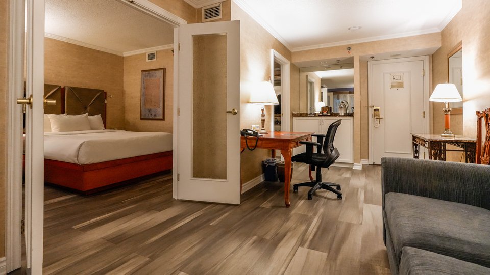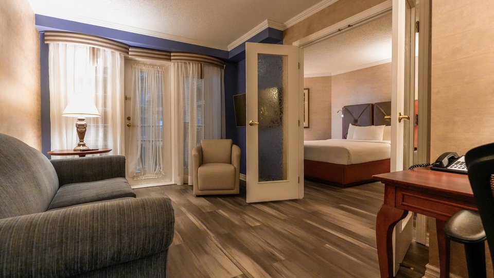 Suite constituée de 2 pièces dont la principale est dotée d’un divan-lit, d’une télévision et d’une table de travail. La chambre des maîtres est dotée de deux grands lits et d’une télévision. Cette suite dispose d’un balcon donnant sur le jardin intérieur.